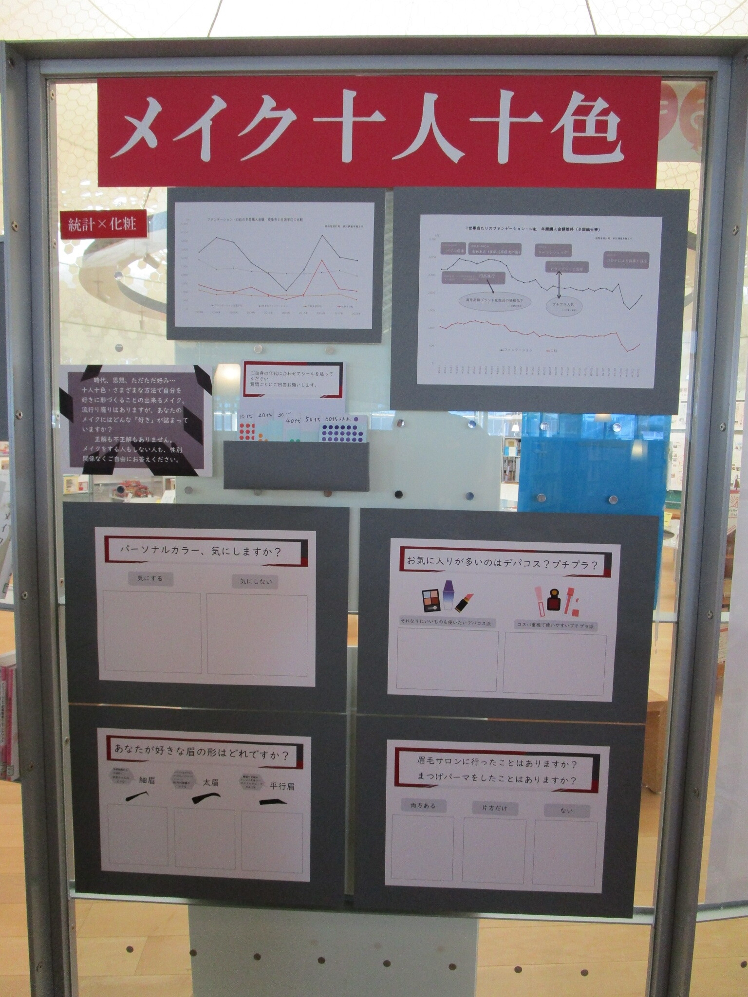 さまざまな場面において『自分をどのように演出したいか』、「化粧」に焦点を当て文化、場面、統計の3つの切り口で展示。世代ごとの色分けシールを貼ってもらうアンケートも取り入れ利用者参加型の展示とした。 |