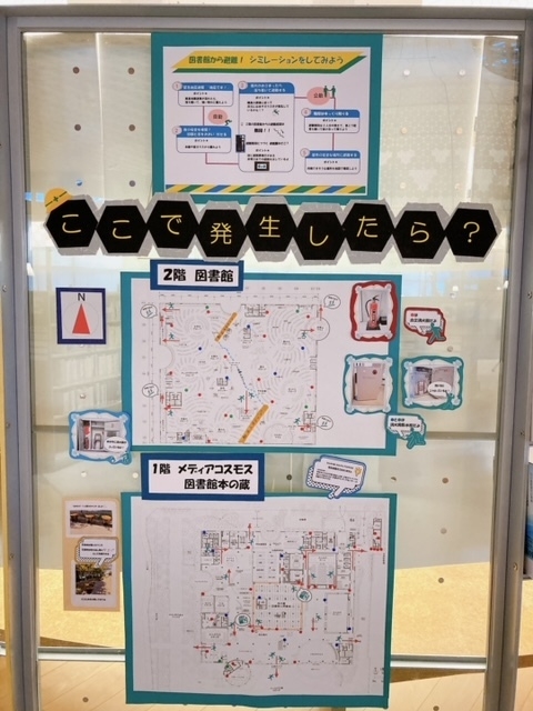 もし、いまここで地震が起きたら?図書館内の避難経路メディアコスモスの災害の備えを紹介。備えておきたいもの、過去の災害についてなど広く書籍や資料を紹介。簡単に作れる段ボールトイレも作り方を示したうえで見本を展示した。 |
