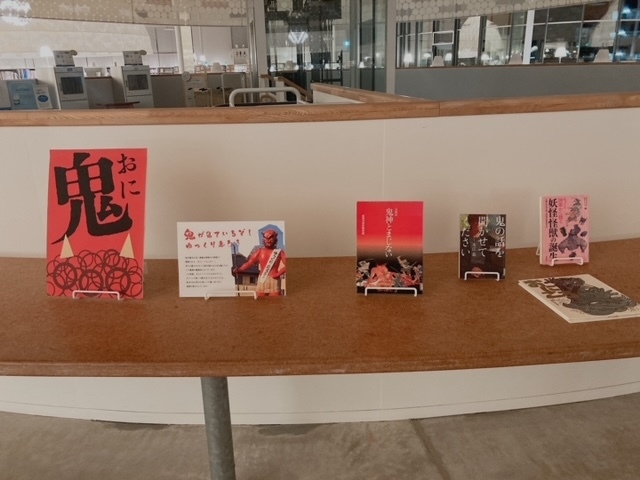 2月の行事節分に関連して、「鬼」をキーワードに選書した展示。岐阜の風物詩加納天神町の玉性院に飾られる鬼の写真とあわせて親子で楽しめる絵本から、大人向けの本まで幅広く展示した。 |