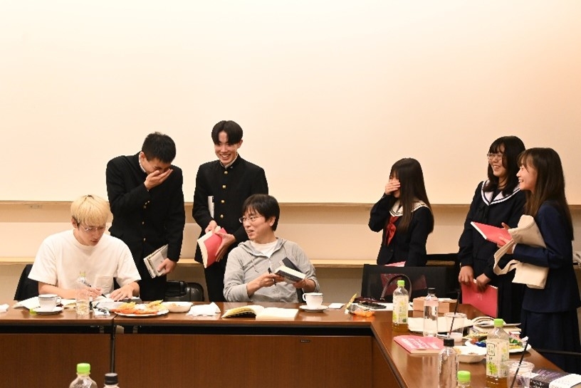 発表会が終わった後は朝井さん、中村さんと発表した8人との交流会。朝井さんがお持ちくださったおいしいお菓子をつまみながらのゆるい雰囲気で自由に質問できるという発表者にとっては夢のような時間です。