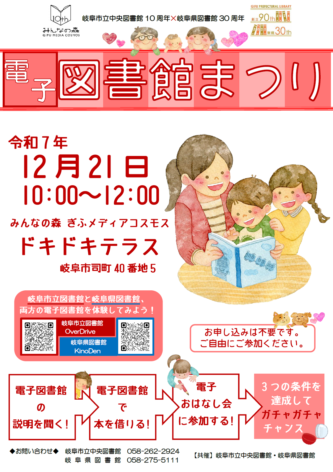 備考岐阜市立中央図書館10周年×岐阜県図書館新館30周年のコラボ企画です。両図書館の電子図書館に触れ、使いこなして読書を楽しみましょう!イベントに参加し、スタンプラリーのスタンプを集めると、素敵な景品が当たるガチャガチャに挑戦できます!