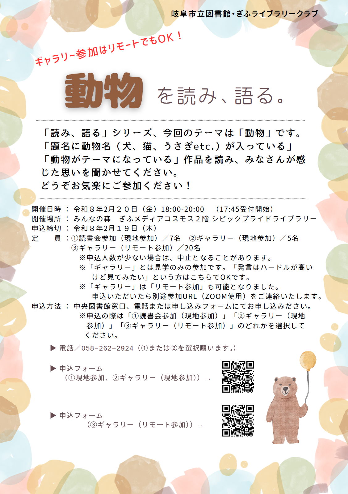 | 主催者 (問い合わせ先) | 岐阜市立図書館 電話:058-262-2924 |